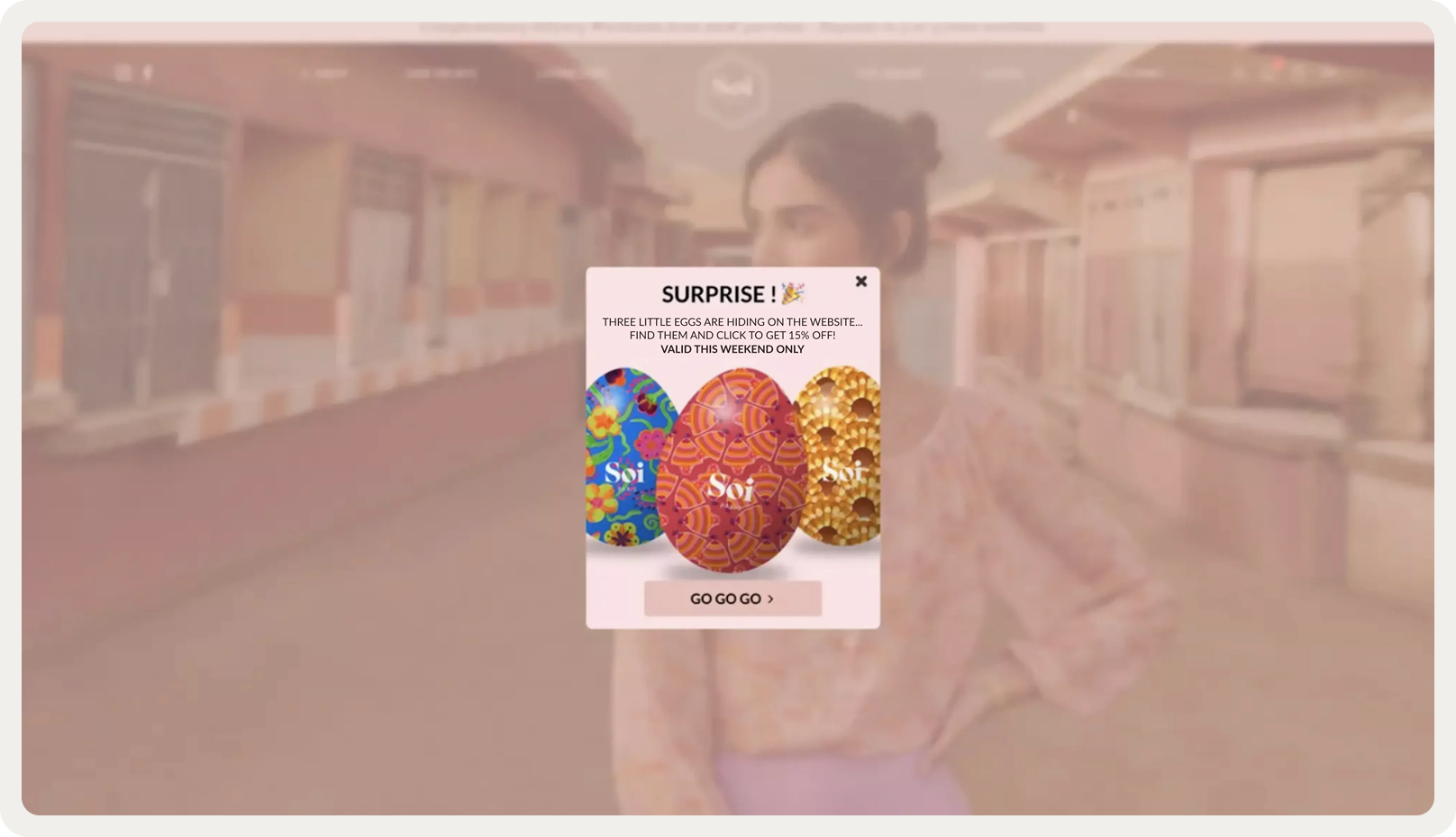 The campaign kicked off with an announcement popup on the homepage. This ensured maximum visibility and explained the rules. Visitors were told to find three eggs hidden across the website to unlock a 15% discount.