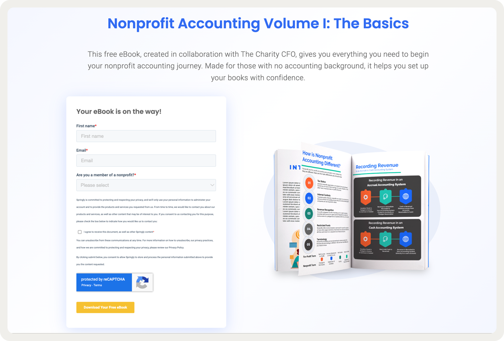 This good-looking campaign promoted an expertly crafted ebook that Springly made in cooperation with The Charity CFO (a nonprofit accounting & bookkeeping service). Since accounting is a common challenge for nonprofits, this ebook is an excellent resource for them.