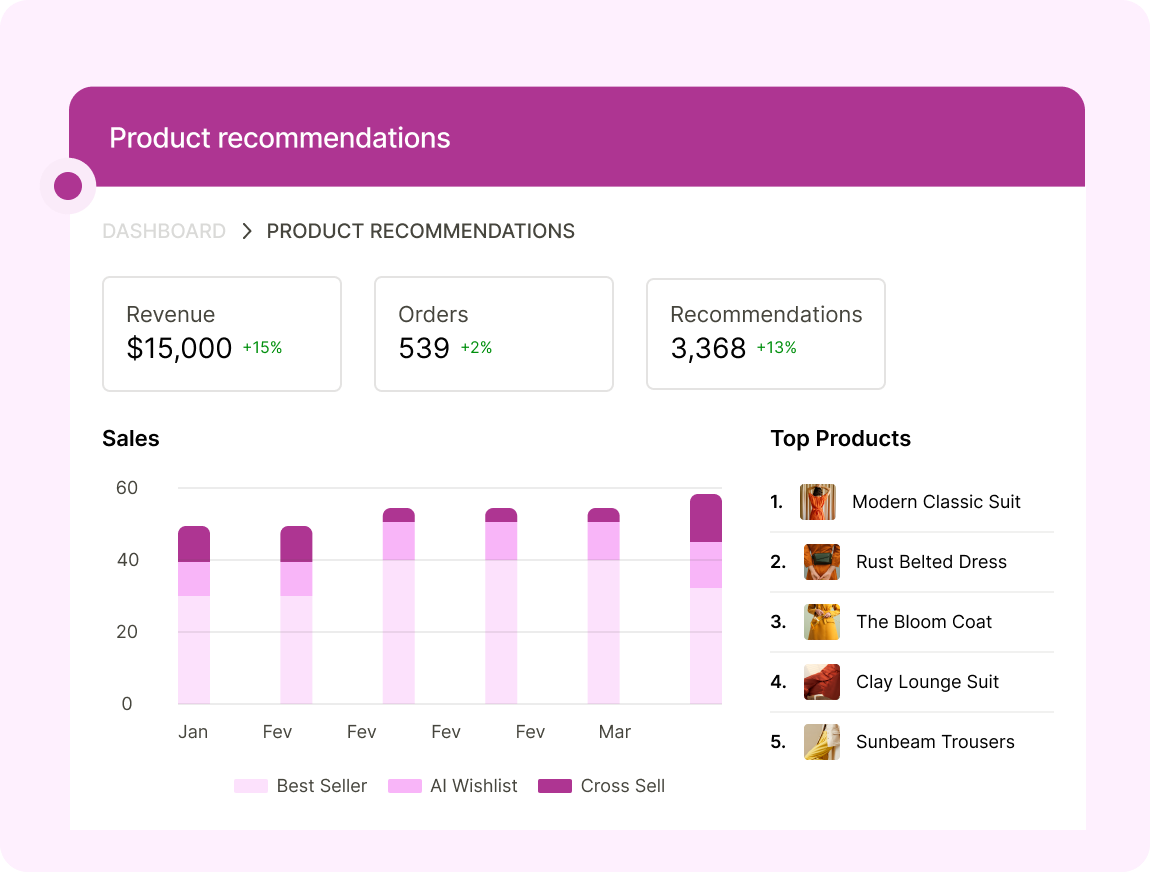 Dedicated Analytics Dashboard: Get real-time views of which products are recommended, clicked and purchased.
